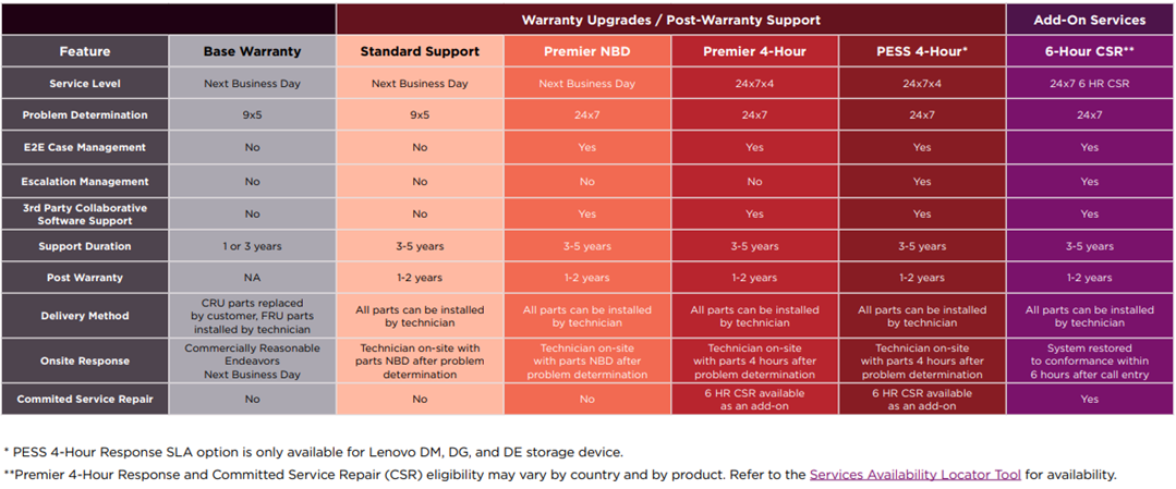 Záruky - Lenovo servery mají v dnešní době v základu záruku na 3 roky NBD (viz obrázek níže), není problém nacenit prodloužení záruky skrze náš Lenovo tým lenovo@atcomp.cz Záruku lze standardně nacenit na 5 let, případně až na 7 let (včetně post warranty servisu). Zde možné typy záruk: